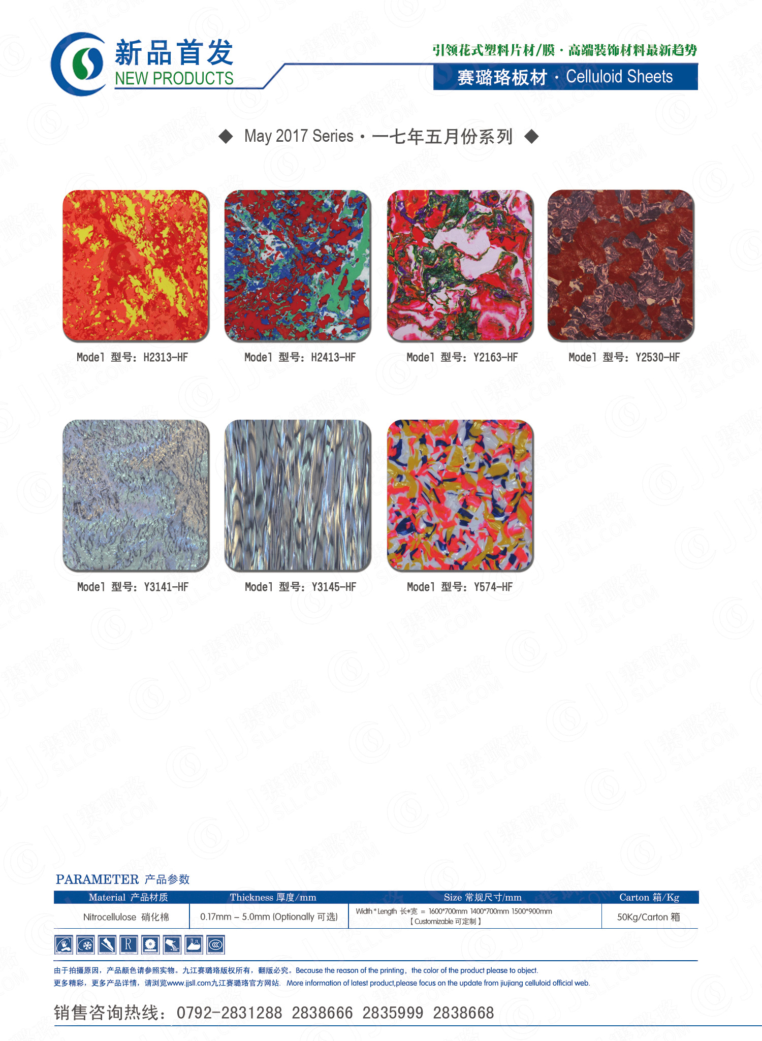 九江賽璐珞實業(yè)有限公司2017年五月及六月份賽璐珞板材、瑪瑙膜、理石膜、樂器裝飾材料、花式PVC片材新品發(fā)布,花式塑料片材/膜·多彩裝飾材料先驅(qū)者。咨詢熱線:0792-2838668 / 2831288 / 2838666 / 2835999。點擊圖片查看詳細(xì)產(chǎn)品